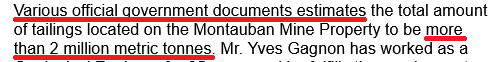 Government documents estimate that the Montauban property contains more than 2 million tonnes of historical tailings (see image below). A 2009 report prepared for Quebec’s Ministry of Environment estimates it to be approximately 3 million metric tonnes.