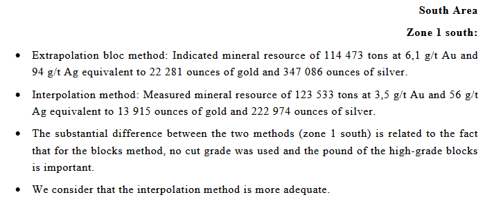 The South Zone 1 was estimated to contain an indicated mineral resource of 114,473 short tons (approximately 103,848 metric tonnes), with a grade of 6.1 g/t gold and 94 g/t silver. This estimate was based on the extrapolation block method and yields 22,281 ounces of gold and 347,086 ounces of silver.