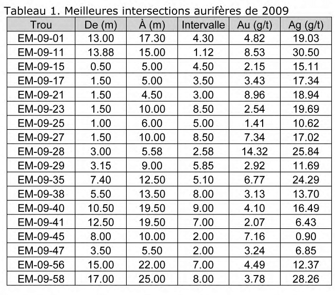 “A diamond drilling campaign was undertaken from October 3 to November 18, 2009 to sample the surface pillar of the North Gold Zone using a series of short vertical holes along the north-south strike of the main mineralization. A total of 52 holes representing 1,505 metres of diamond drilling were carried out. The best gold intersections were encountered in hole EM-09-27 (7.34 g/t Au over 8.5 metres) and hole EM-09-28 (14.32 g/t Au over 2.58 metres).” (MRB et Associés, 2010) Source: GM65297 hyperlink